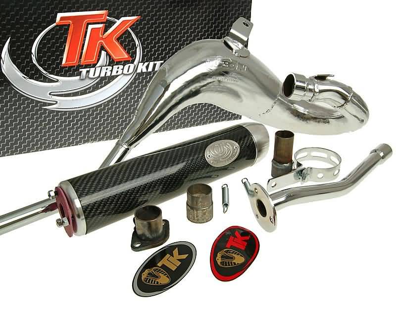 Bei Insidern steht der Name Turbo Kit schon seit langem im Einklang mit maximaler Leistung. Die Racing Turbo Kit Auspuffanlage Carreras 80 ist speziell für 80ccm Zylinder konzipiert und gehört wohl zu den leistungsstärksten Anlagen in dieser Klasse. Bis dato einzigartige Features wie beispielsweise ein riesiger Krümmeranschluss von über 30mm sprechen für sich und lassen Raum für eine individuelle Gestaltung des Auslassports. Die Leistung steht bei diesem Mopedauspuff definitiv im Vordergrund.