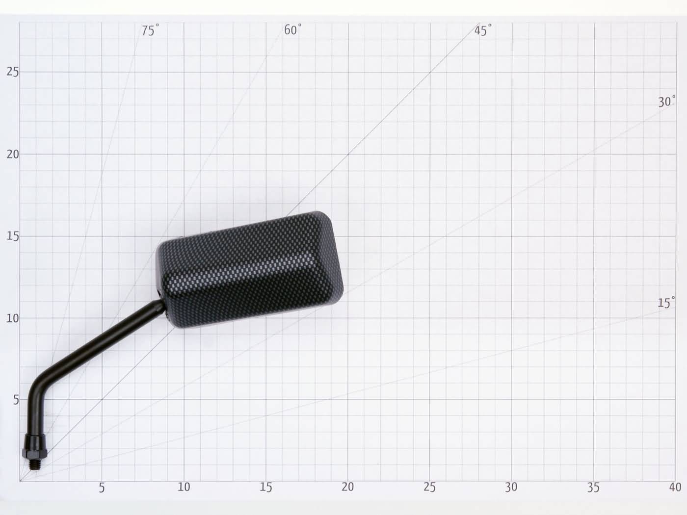 F1 Spiegel im Carbon-Look mit kurzer Halterung für Lenker rechts. Der Spiegel verfügt über ein M8 Rechtsgewinde und kann mit Hilfe des beiliegenden Adapters auf M8 Linksgewinde umgerüstet werden.