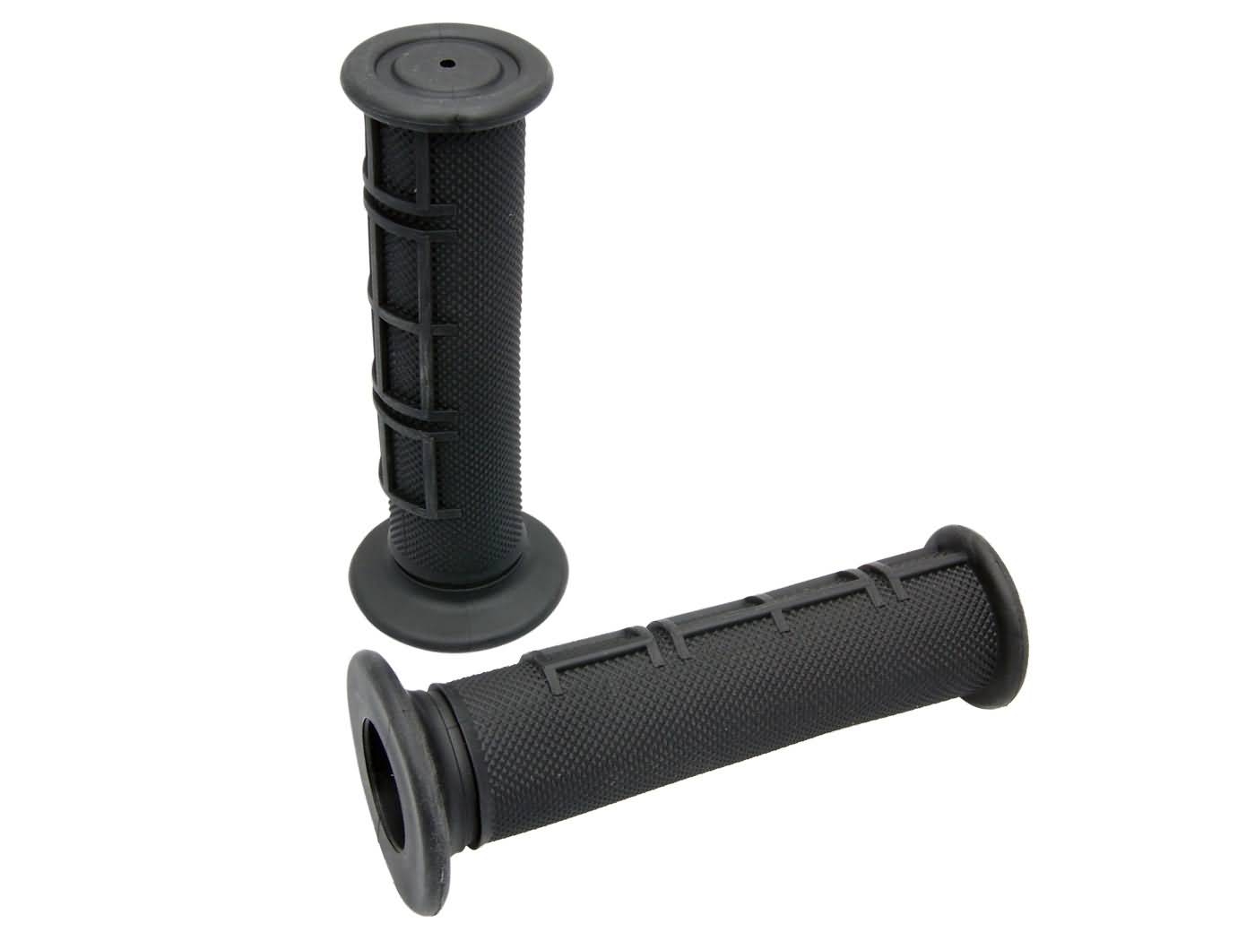 Schwarze Griffgummis im klassischen Motocross-Design für alle Roller, Mopeds und Motorräder mit 22mm Lenker und Drehgasgriffhülse.